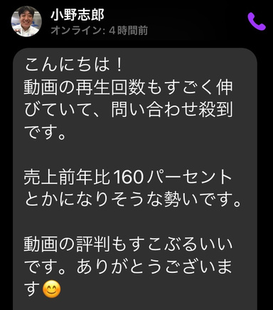 他にも、動画とビジネスを合わせることで、創業以来10年以上赤字だった会社様が動画公開2年で売上2億円を達成するなど、さまざまな報告をいただいております。